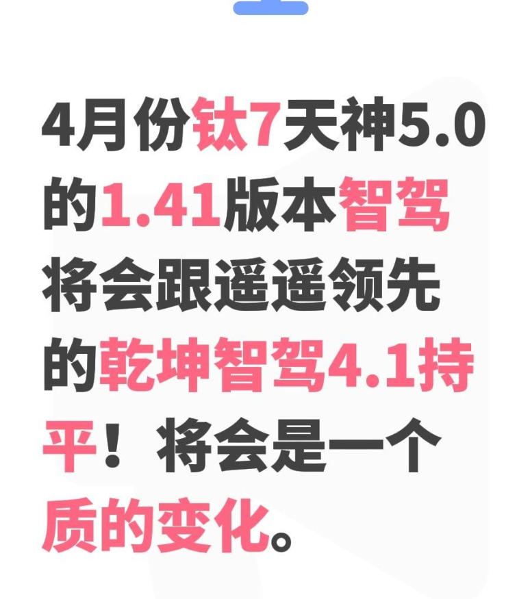 对车主来说,4 月不仅是一场发布会,更是一次 “爱车免费升级” 的福利。OTA 1.41 推送后,方程豹钛 7 将实现脱胎换骨的变化,智驾流畅度、安全性、便利性全面提升。而对整个市场来说,这也意味着智驾赛道的竞争进一步白热化,头部玩家再添强援,用户将成为最终受益者。